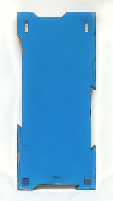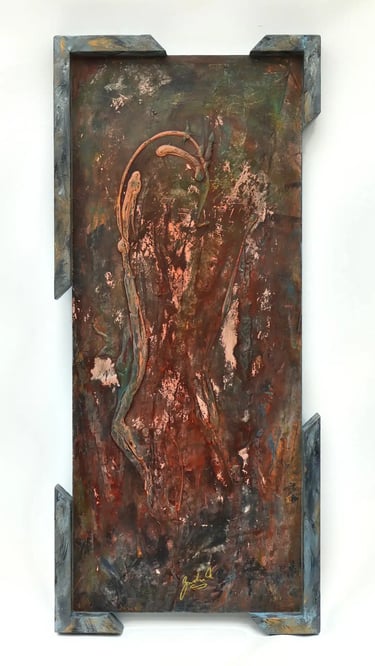 Dieses Acrylbild mit gestückeltem Rahmen war bereit für ein provisorisches Foto, als ich dem Rahmen beim Zurücktragen in die Werkstatt eine tiefe Delle verursachte. Nach einigem Frust darüber legte ich das Werk zunächst beiseite. Wochen später entschied ich: Viele Dellen sind besser als eine einzige.