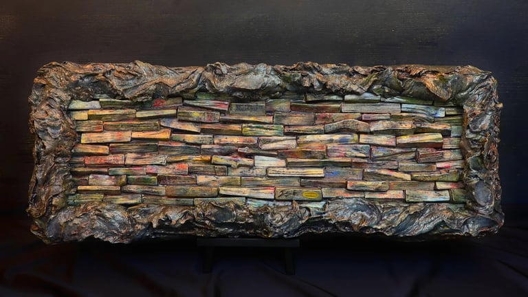 Die Fertigstellung dieses Spiegels mit einem kombinierten Rahmen aus Gips und Holzscheiten ist geplant für Jänner 2026. Hier entsteht soeben die erste Holzreihe des Rahmens.